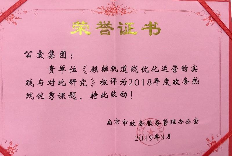 2019年6月28日,南京公交集團(tuán)捧回2018年度市12345政務(wù)熱線工作先進(jìn)單位獎牌,《麒麟軌道線優(yōu)化運營的實踐與對比研究》榮獲了南京市政務(wù)辦唯一一個優(yōu)秀課題獎。